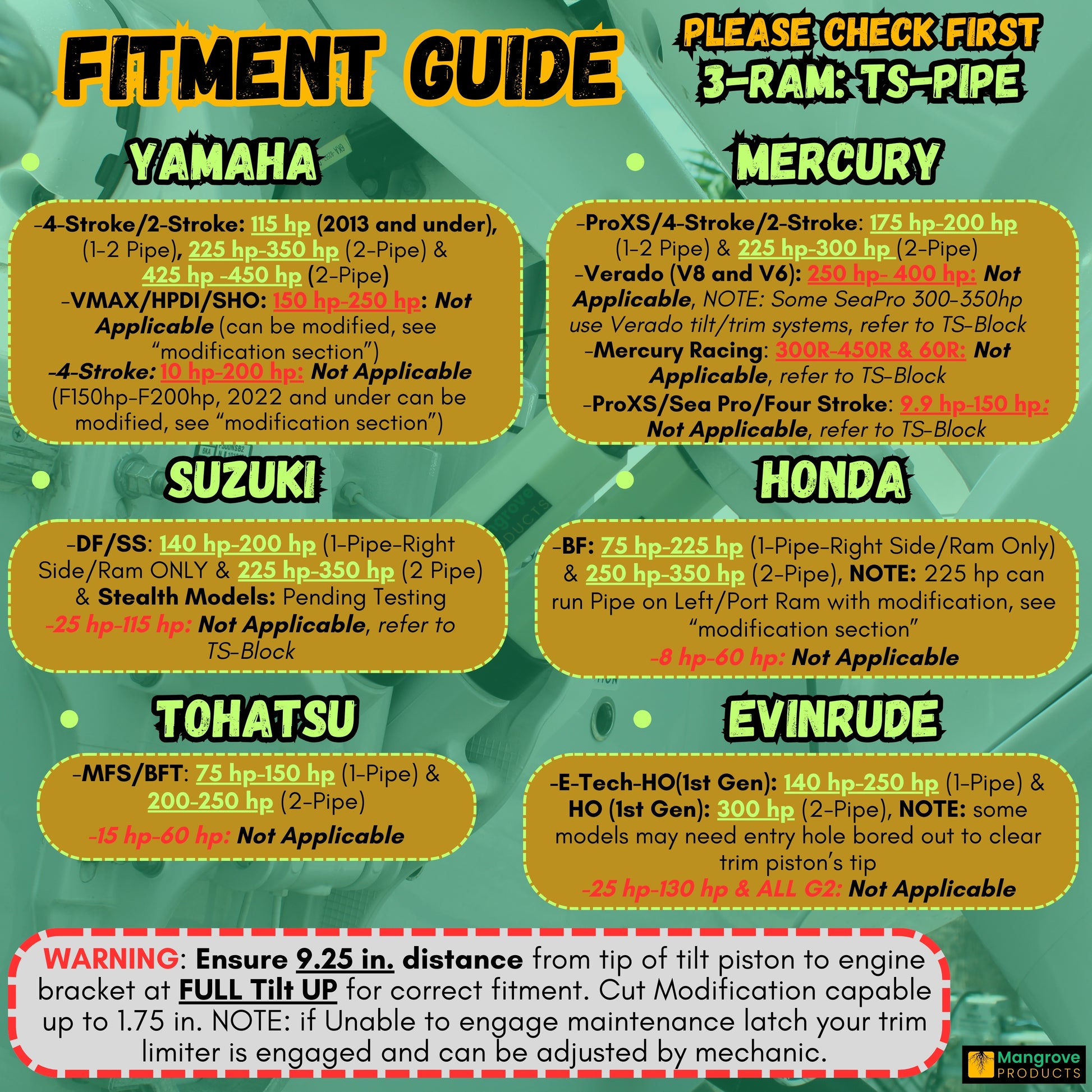 Compatible with many outboards from Yamaha, Mercury, Suzuki, Honda, Tohatsu, and Evinrude equipped with 3-RAM hydraulic tilt/trim systems. (ST-Stops) Steering stabilizers fit 3/4 in, 25/32 in, and 7/8 in hydraulic steering shafts with 4-inch rams, including systems from SeaStar, BayStar, ProTech, Silver Steer, GoTech, Uflex and others.