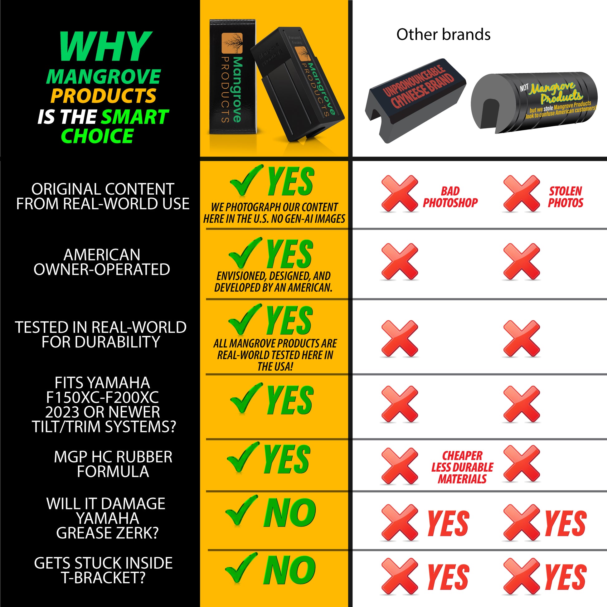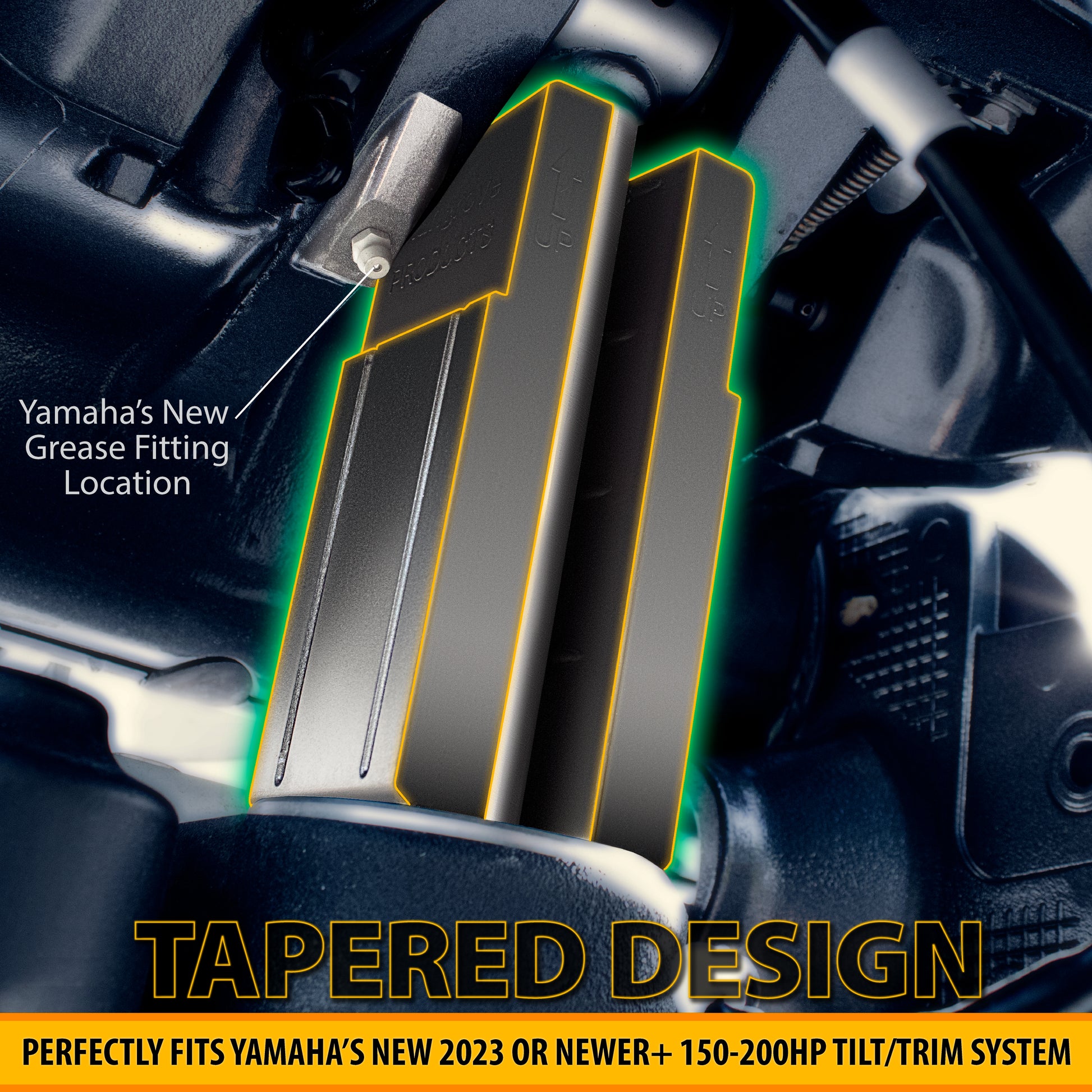 ✅ NOTE/INFO: This is currently the only rubber transom saver variation available for Yamaha's new single ram tilt/trim system. Our new upper taper design allows the custom TS-Block to bypass Yamaha's new dual grease zerks and fit snuggly into place without damaging your outboard. It is important to note that placement with the "Mangrove Products" logo to face forward before compression for best fitment.Â
