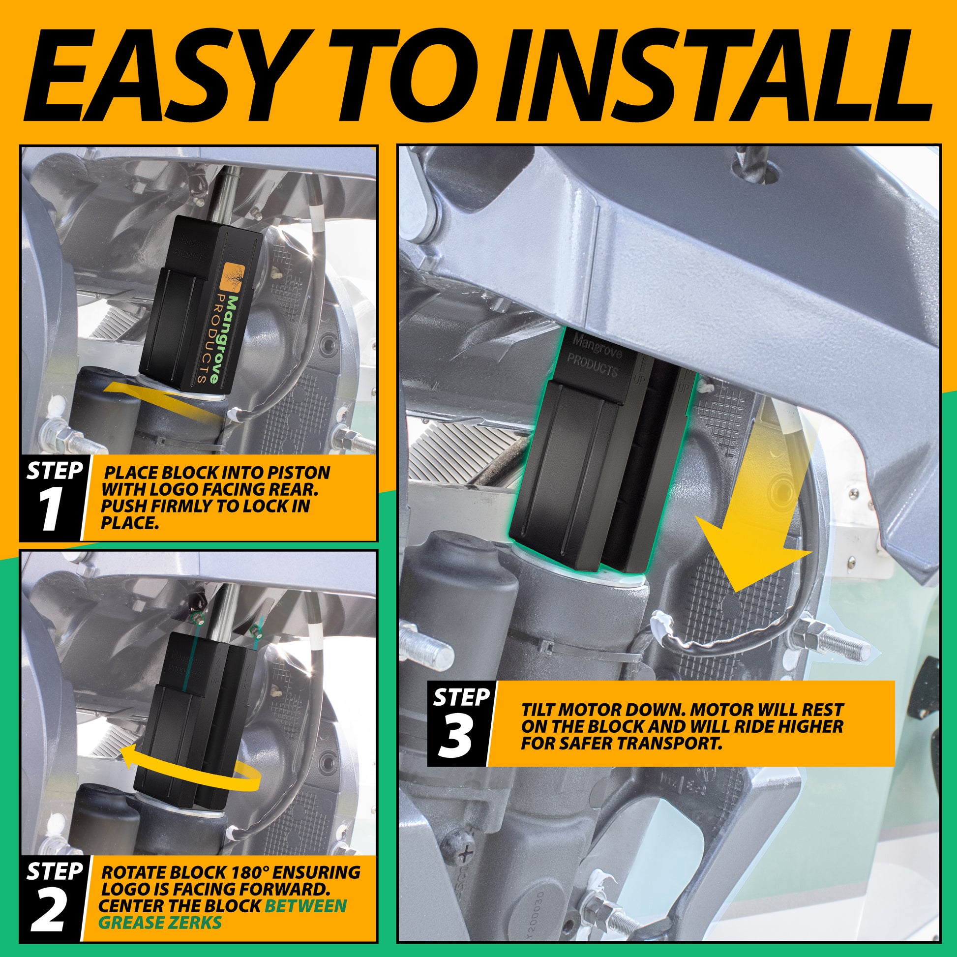 ✅ Simplify Boating: Make your life easier and more enjoyable by eliminating the worry of potential damage your outboard motor or transom when trailering your boat to your favorite fishing spot with the family, so you can focus on the fun. Creating a barrier to downward force of gravity can positively reduce damage to tilt and trim unit when hitting bumps on roads and highways. The High pressure wedge creates this safe barrier to brace and prevent negative downward force to the tilt/trim unit.