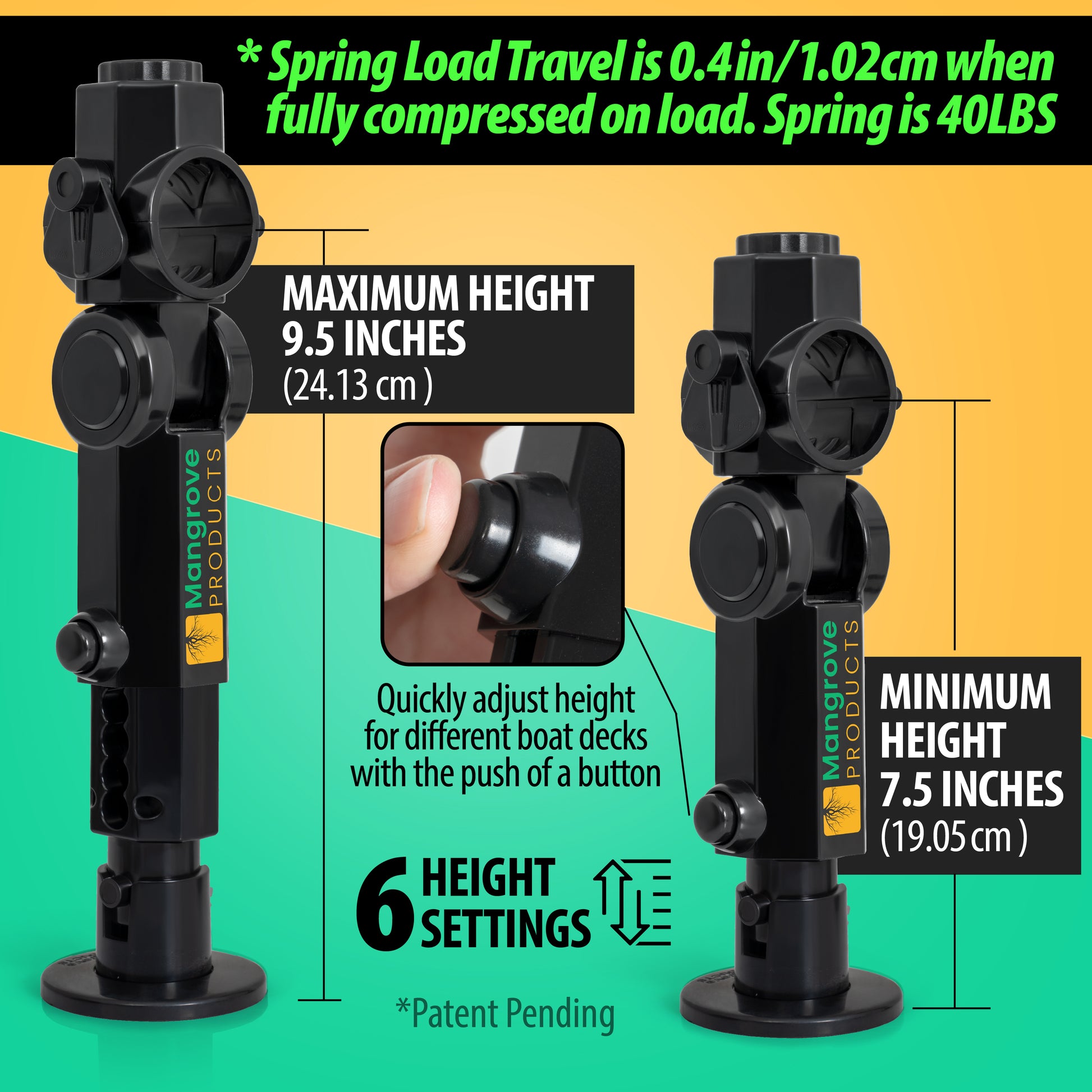 ✅INNOVATIVE DESIGN: We use strong material PVC/ABS hybrid liner, Mangrove Products rubber formula, 6 setting up and down extension, locking upper clasp with rubber coated inside pad to prevent scrapping to shaft, hardware metal 316 Stainless Steel, 90 degree fold/ lock to parallel with shaft when fishing, wide rubber non-skid base to provide stability coverage on impact, 30-pound internal shock absorbing 316 stainless steel spring, and locking shaft housing.