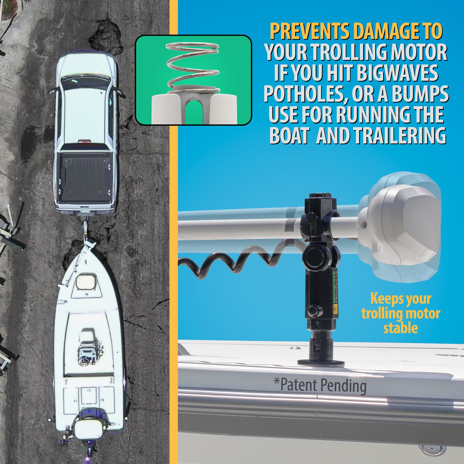 ✅EASY TO USE APPLICATION: No drilling required. Simply attach trolling motor stabilizer to shaft and adjust stabilizer height and shaft diameter with ease for secure fitment. For the long runs to your fishing spot, long trailering trips, or back to the boat ramp your trolling motor will have safe support with integrated shock absorber to prevent unwanted movement from big waves and chop. When you are done remove and can easily fit into storage hatch. Boat accessories must have.